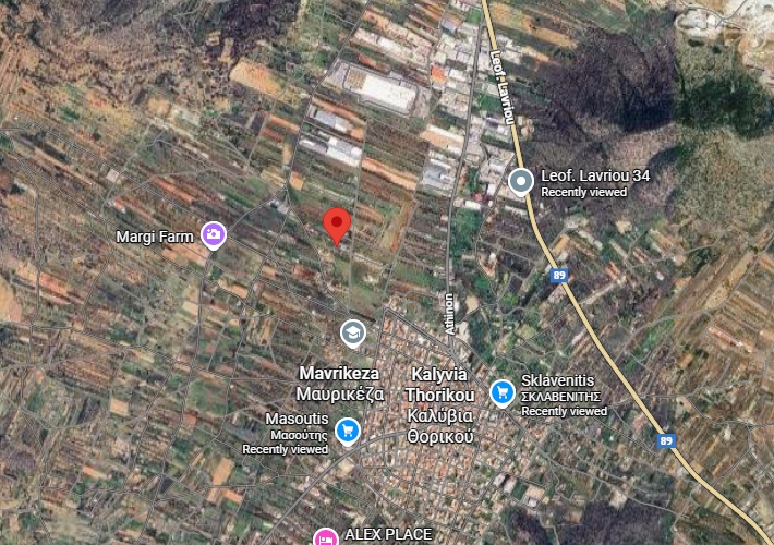 Επαγγελματική αποθήκη 400 τ.μ. με 2 συρόμενες μεταλλικές πόρτες βιομηχανικού τύπου, σε αγροτεμάχιο 4.064 τ.μ. στη θέση Πάτημα-Ελλιά Αγγελή, Καλύβια Θορικού. Περιβάλλων χώρος με ελαιόδεντρα.