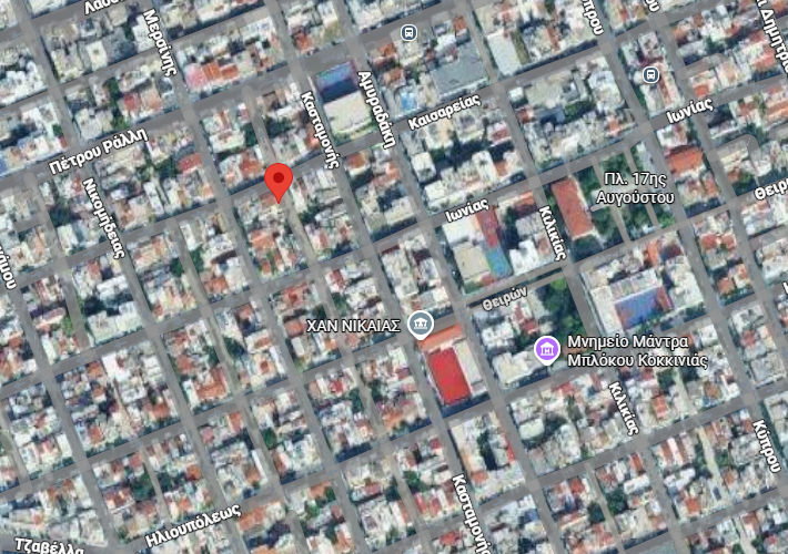 Μονοκατοικία 141 τ.μ., σε οικόπεδο 47 τ.μ., στην 1η Πάροδο της οδού Καισαρείας 115, Νίκαια. Ισόγειο, 1ος και 2ος όροφος 47 τ.μ., έκαστος. Κοντά σε σχολεία, πλατείες, στο άλσος Βώκου, στην οδό Πέτρου Ράλλη και στο σταθμό Μετρό Νίκαια.