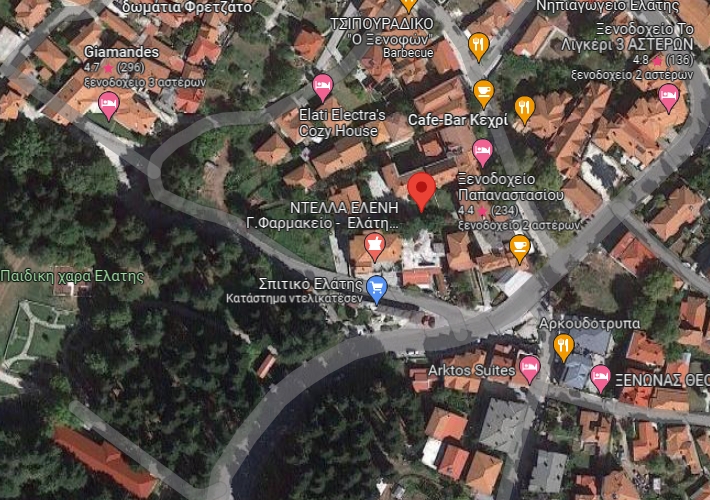 Ξενοδοχειακή μονάδα 2 αστέρων 1.480,80 τ.μ. με 34 δωμάτια και 77 κλίνες, σε οικόπεδο 2.096,41 τ.μ. στη θέση Σταυρός, Ελάτη, Τρίκαλα. Υπόγειο 227,66 τ.μ., δωμάτια, αίθουσα πρωινού, λεβητοστάσιο, πλυντήριο, σιδερωτήριο, WC, αποθήκη και βοηθητικοί χώροι. Ισόγειο και 1ος όροφος 1.253,14 τ.μ., με δωμάτια, αίθουσα μπαρ και πρωινού, καθιστικό, εστιατόριο, γραφεία, διάδρομοι, βοηθητικοί χώροι και εσωτερικές σκάλες. Κοντά σε αγορά, σχολείο και πλατεία.