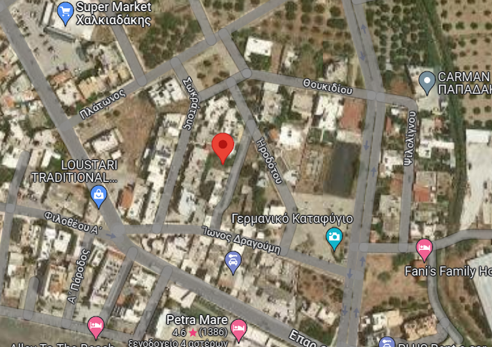 Μονοκατοικία 350 τ.μ., σε οικόπεδο 240,27 τ.μ., τμήμα οικοπέδου 1.728,70 τ.μ., στην οδό Ηροδότου 2, Ιεράπετρα, Λασίθι. Υπόγειο 130 τ.μ., βοηθητικός χώρος. Ισόγειο 130 τ.μ. 1ος όροφος 90 τ.μ. Κοντά σε σχολεία, στην πλατεία Μικρασιατών και στην παραλία Ιεράπετρας.