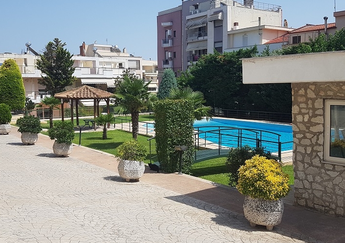 Maisonette 188,25 sq.m. with terrace room, in a housing complex on a 3.549,54 sq.m. plot, at 77 Georgiou Gennimata street, Kalamaria. Basement 99,40 sq.m., 2 open-plan and corridor. Indoor staircase and lift. Ground floor 88,85 sq.m., 2 bedrooms, open-plan living room, dining room, kitchen and bathroom. Two parking spaces 13,50 sq.m. each. Exclusive use of uncovered spaces 164,10 sq.m. Luxurious construction with shared swimming pool.