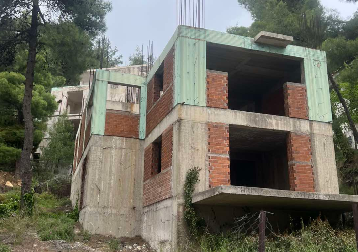 Partly complete detached house 368 sq.m. in a 1.038 sq.m. plot, at 7 Grevenon street, Thrakomakedones, Basement 124,40 sq.m., storage room, boiler room, swimming pool machine room, ramp and 2 parking spaces 10,12 sq.m., each. Ground floor 124,60 sq.m., open plan sitting room and dining room, kitchen, hall, WC and semi-outdoor space.. 1st floor 119 sq.m., 5 bedrooms, hallway, wardrobe, 2 bathrooms and semi-outdoor spaces. Indoor staircase and lift. Exclusive use of a shared open area 454,40 sq.m. Completed 35%. Near school and Thessaloniki Street.